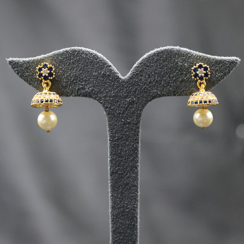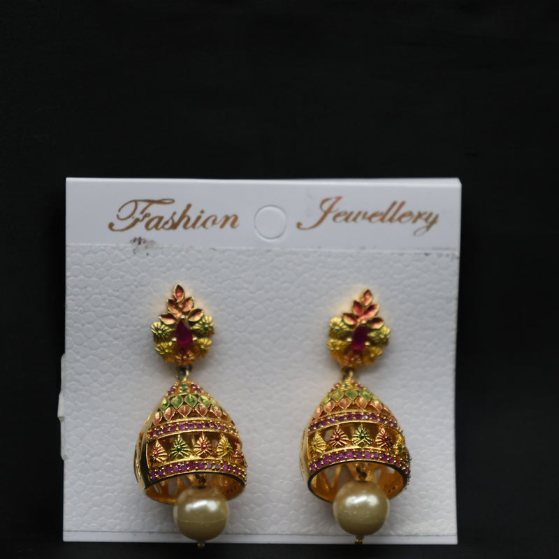 Royal Dome Jhumka Earrings with Ruby Accent & Pearl Drop in Copper-Brass