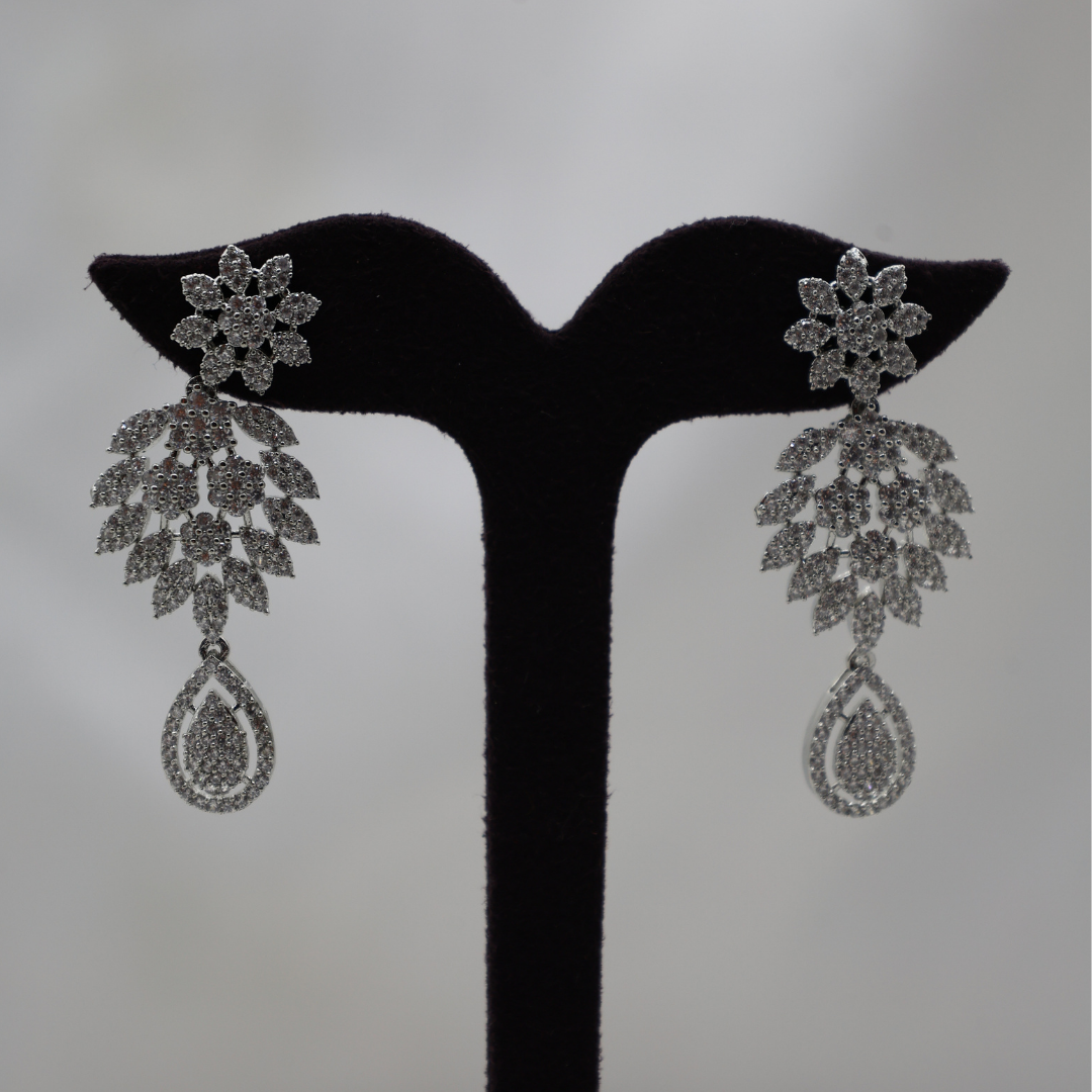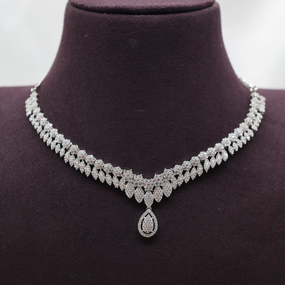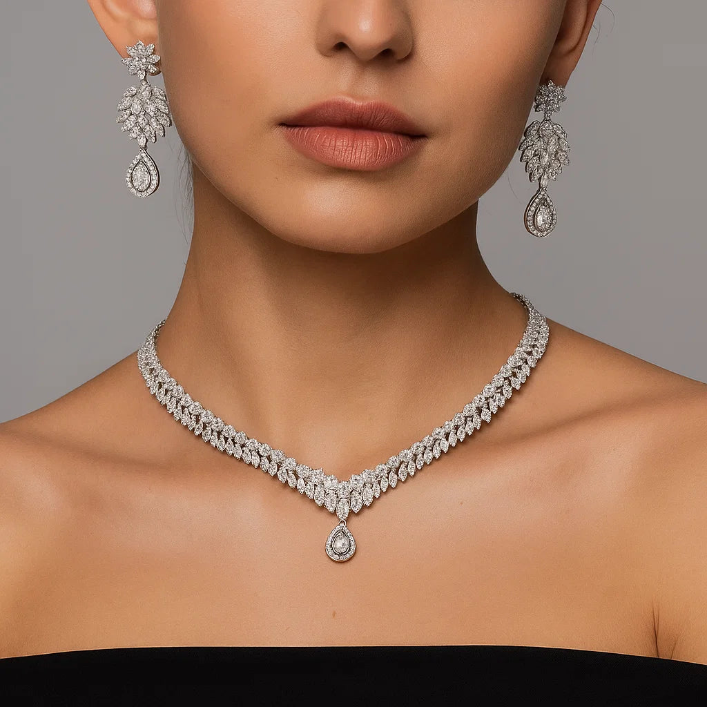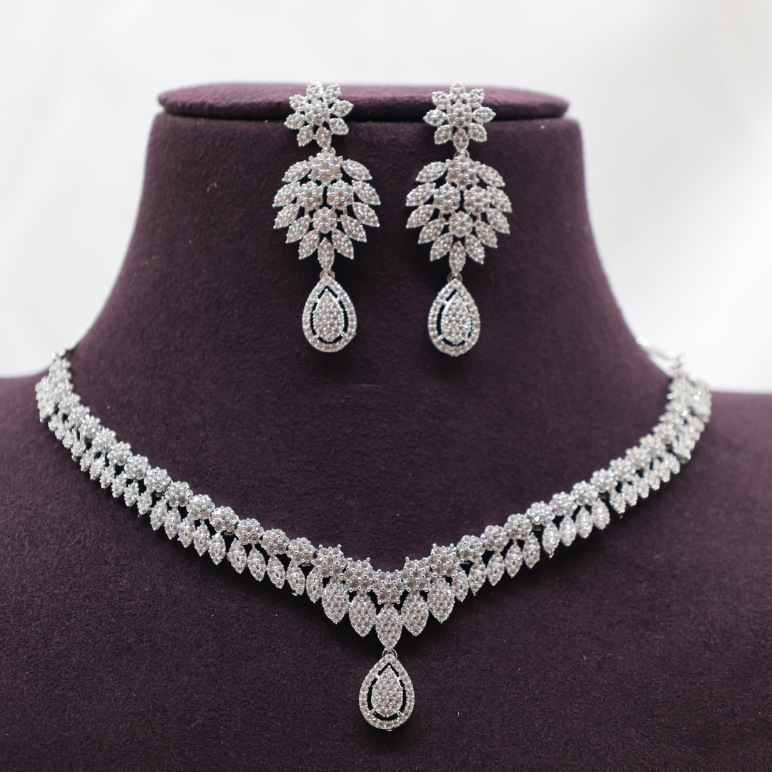 Bridal Leaf Layered AD Necklace Set | Silver-Plated Floral Drop Earrings