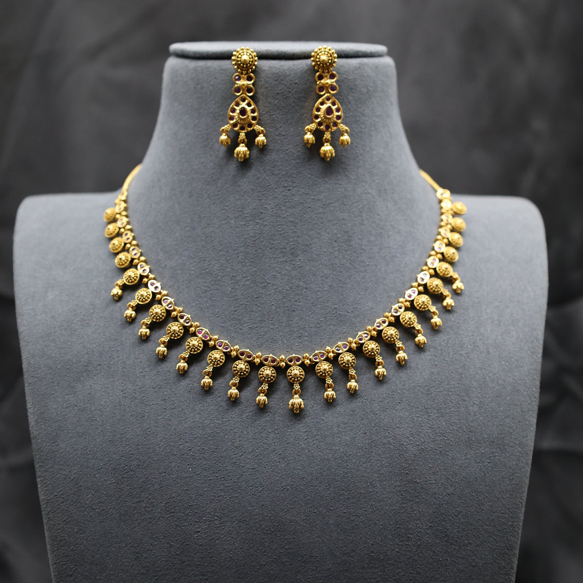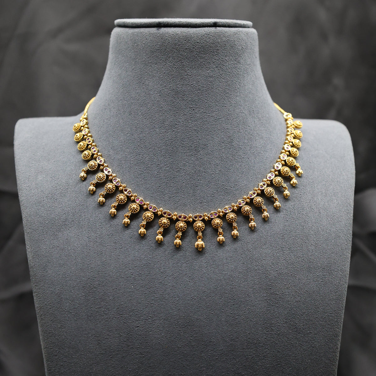 Elevate your traditional look with this elegant antique gold-plated temple-style necklace set. The design features delicate beaded motifs with fine detailing, accented by tiny red stones for a subtle yet striking appeal. Dangling bead drops add graceful movement, while the matching long drop earrings complete the look, making it the perfect choice for weddings, festive occasions, and cultural celebrations.