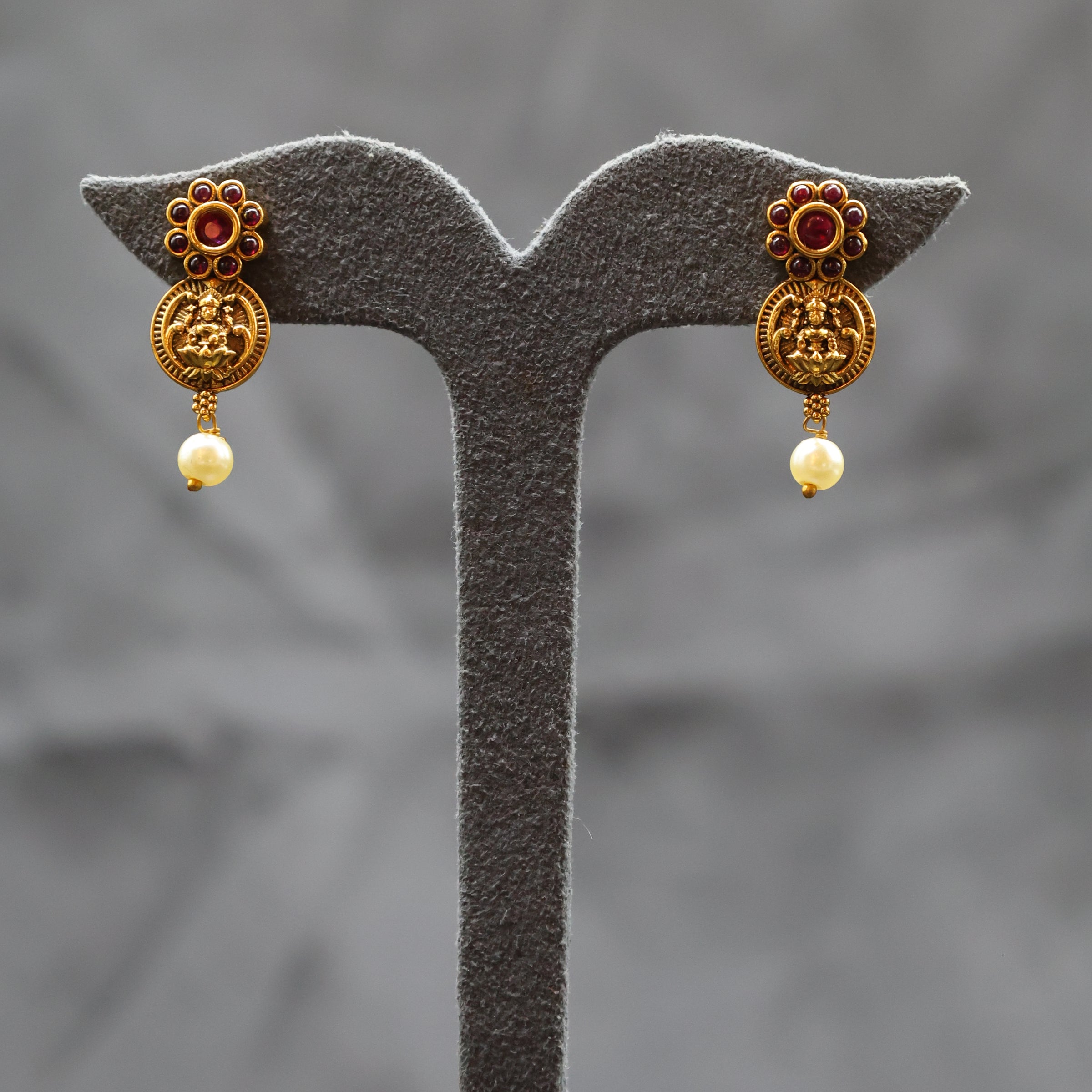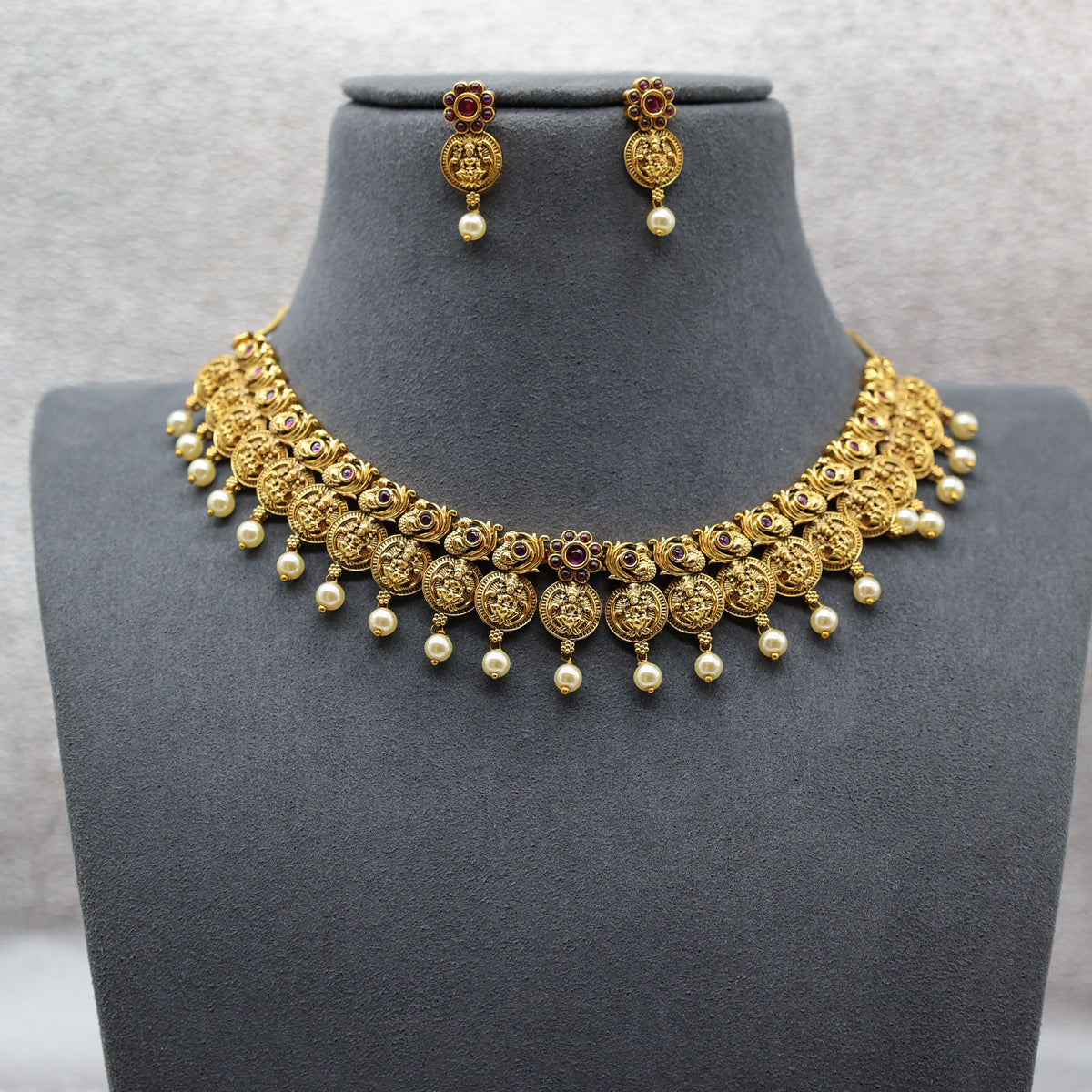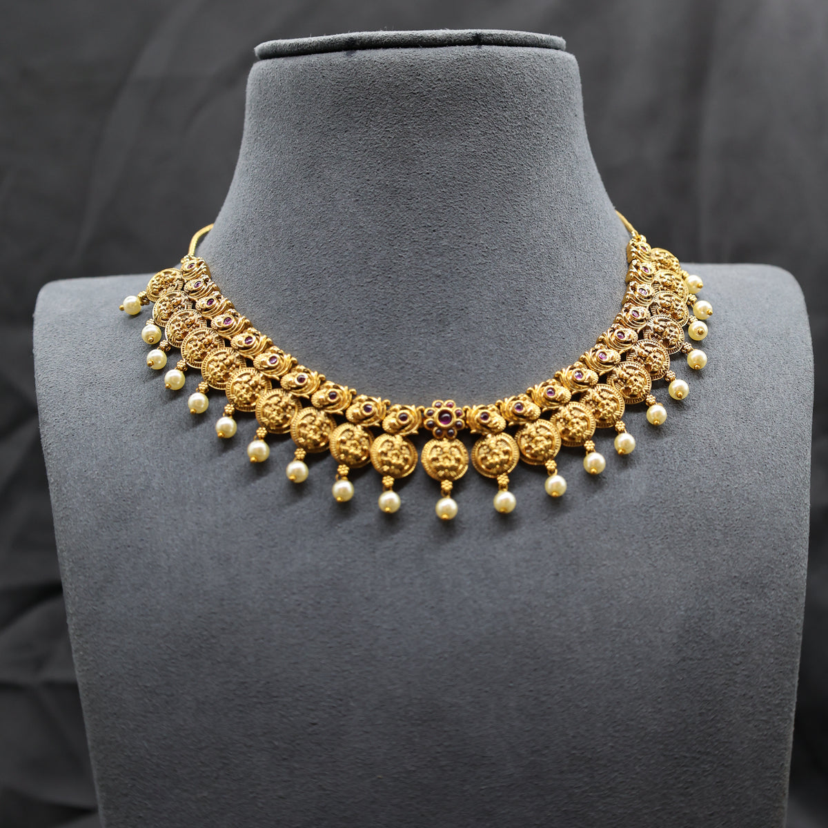 Celebrate tradition and grace with this antique gold-plated temple coin necklace set. The necklace features intricately designed coin motifs adorned with goddess engravings, enhanced with ruby-red floral accents. Delicate pearl drops add a touch of sophistication, making it a timeless piece for bridal and festive wear. Paired with matching coin earrings accented with pearls, this set completes your divine traditional look.
