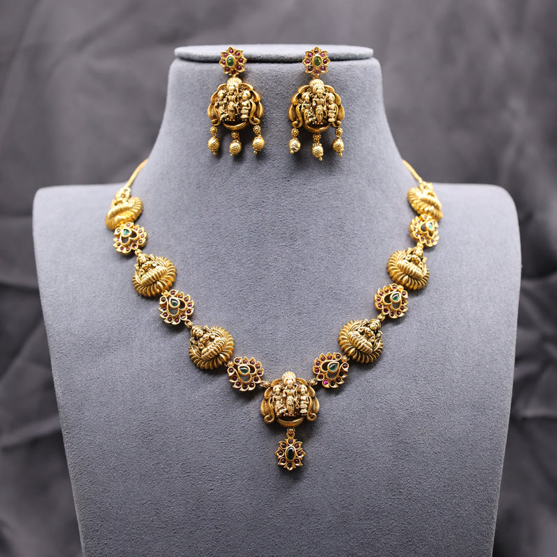 Embrace divine elegance with this antique gold-plated temple-style necklace set.
