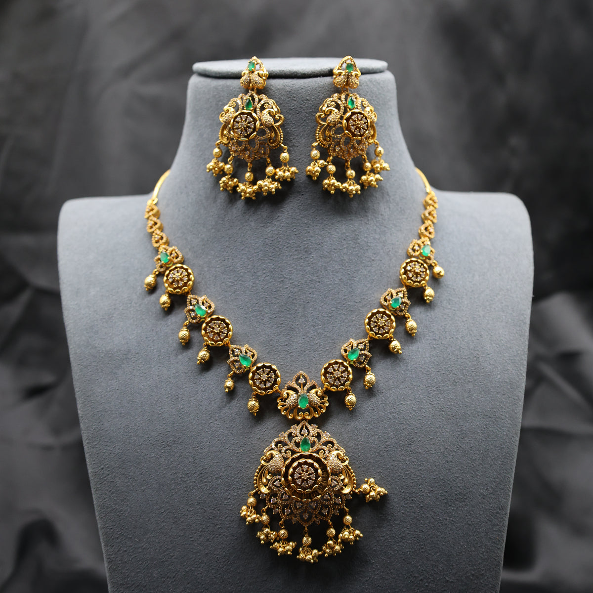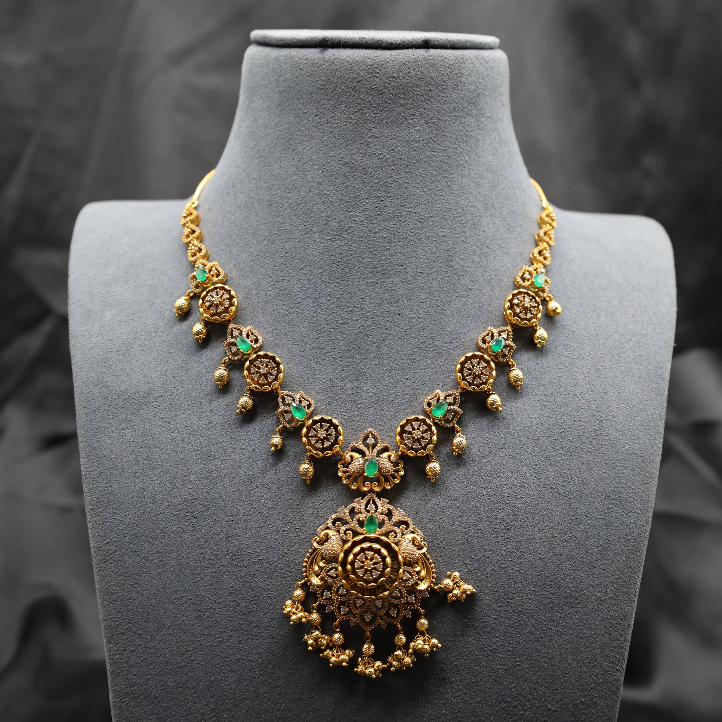 Make a regal statement with this exquisite temple-style necklace set handcrafted from copper and brass. The necklace features a series of intricately carved circular floral motifs, each adorned with shimmering emerald-green stone accents for a touch of vibrance. The grand pendant, with its ornate filigree design and bead danglers, adds an opulent centerpiece to the set. Complementing the necklace, the matching jhumka-style earrings mirror the same craftsmanship and elegance, completing this timeless traditional ensemble.