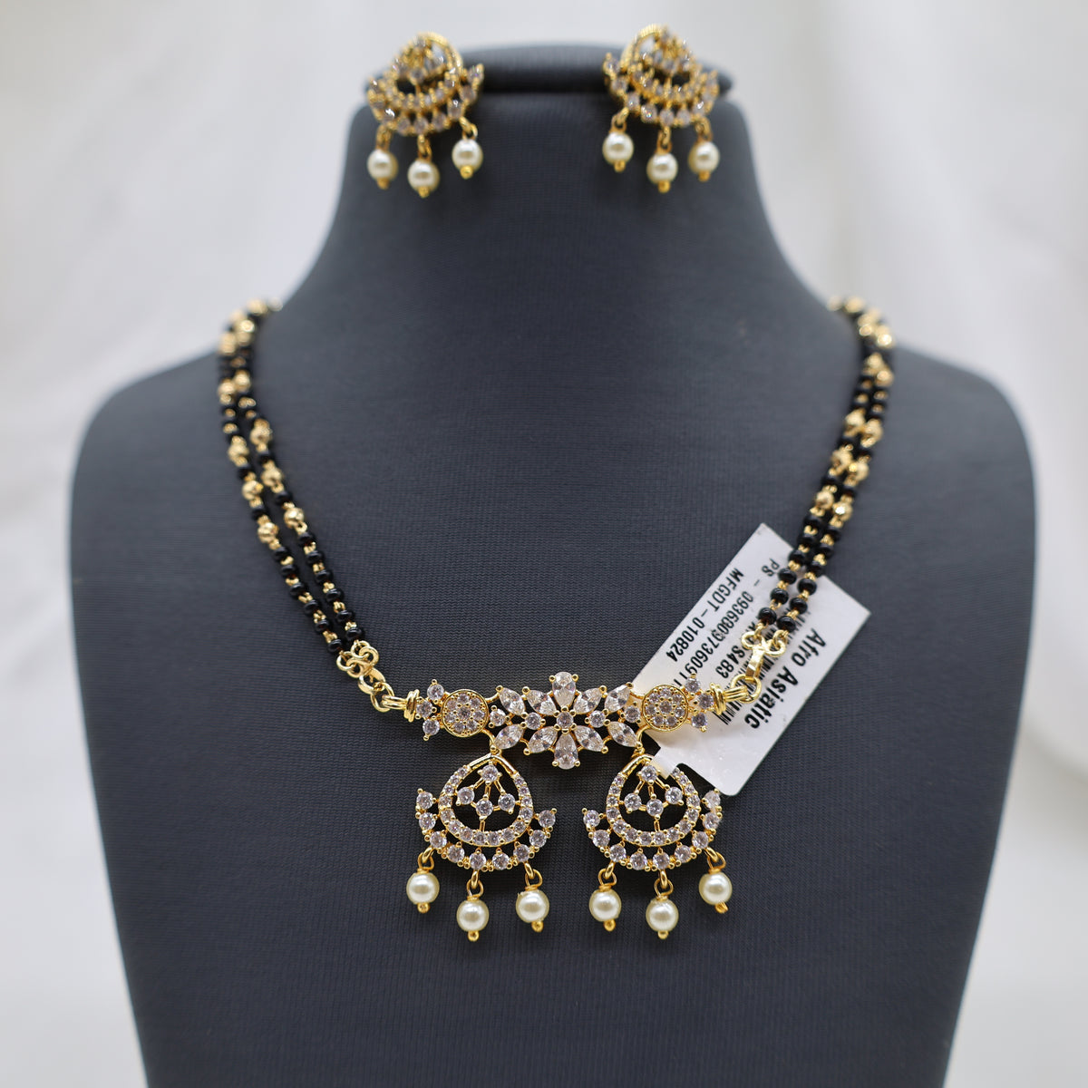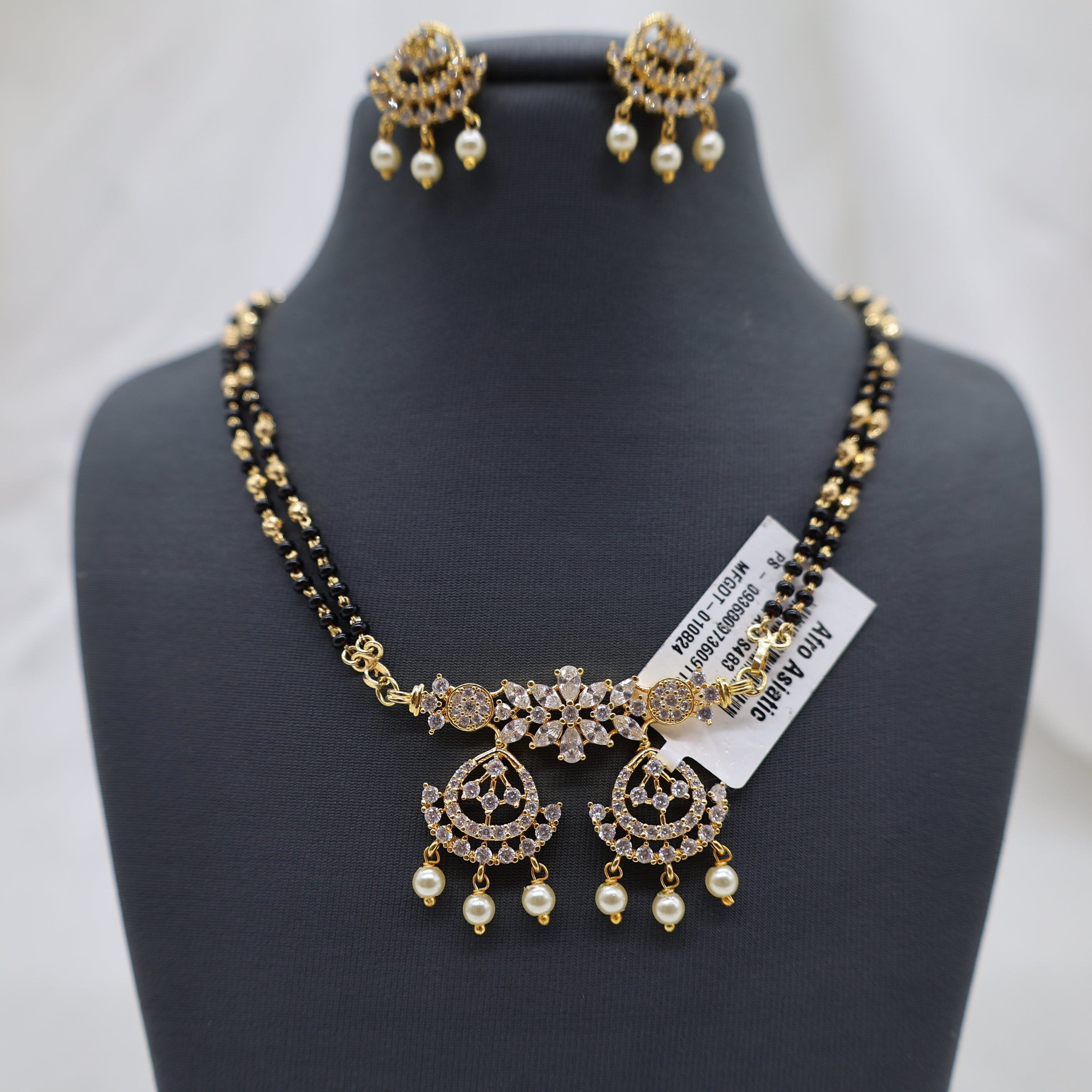 Celebrate tradition with elegance through this beautifully crafted mangalsutra-style necklace set, made from high-quality copper and brass with a rich gold finish. The necklace features a classic double-strand black bead chain, leading to a captivating centerpiece designed with sparkling CZ stones in a floral motif. The pendant is enhanced with delicate pearl danglers, creating a perfect balance of cultural charm and graceful sophistication.