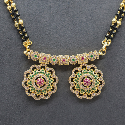 Showcasing twin floral motifs, this elegant mangalsutra combines timeless tradition with vibrant beauty. The pendants sparkle with green, pink, and white American Diamonds, creating a festive and radiant appearance.