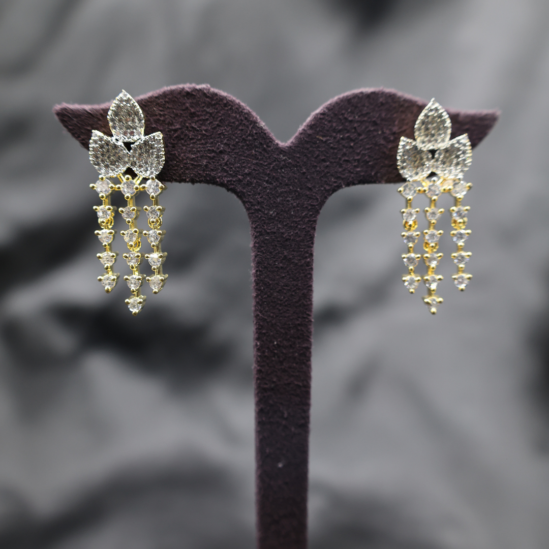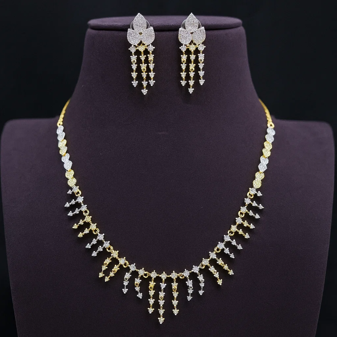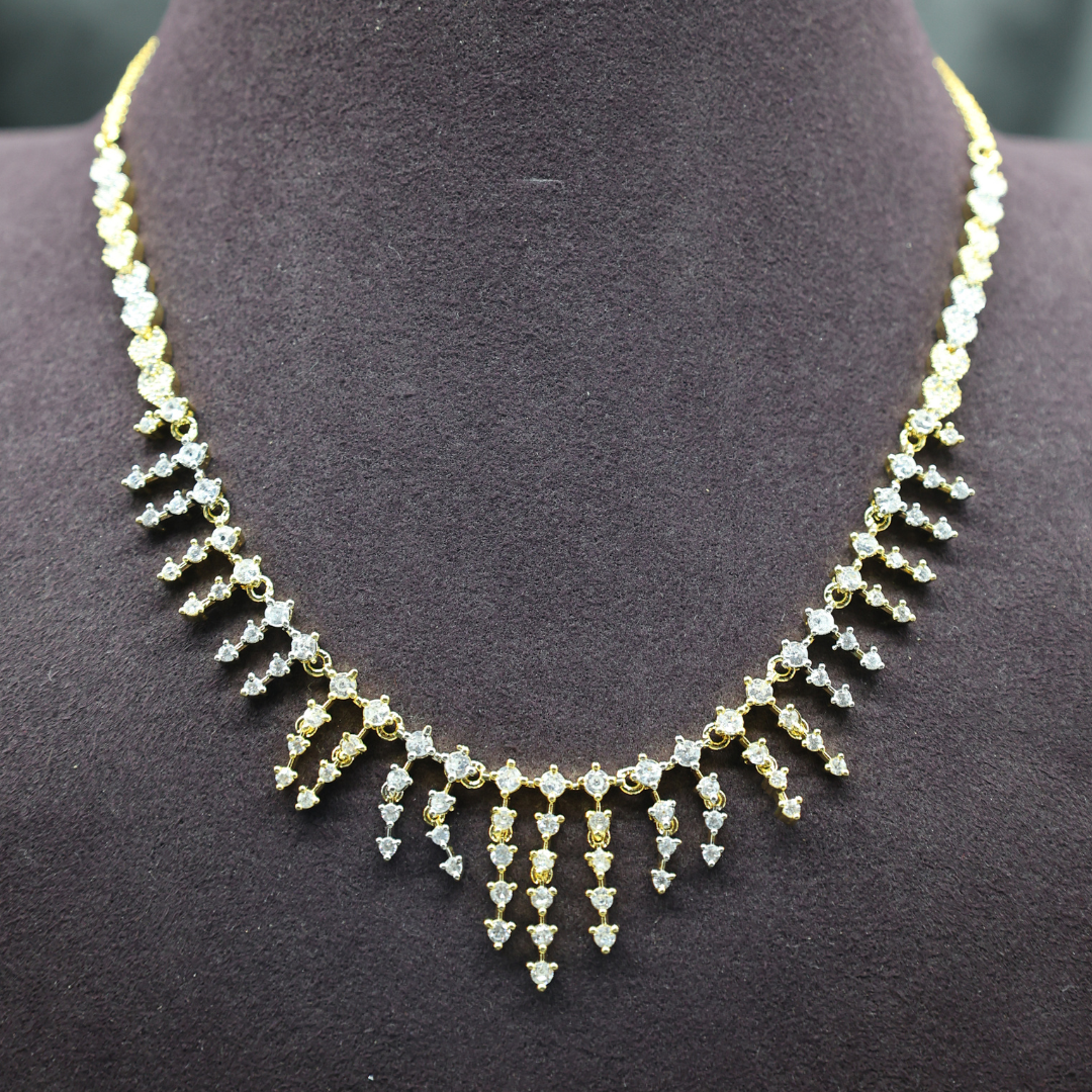 Drape yourself in elegance with this stunning cascading AD necklace set. Designed with precision-cut American Diamonds arranged in a graceful drop pattern, this silver-plated set shimmers beautifully with every movement. The matching earrings mirror the cascading effect, making this ensemble perfect for weddings, cocktail nights, and grand occasions.