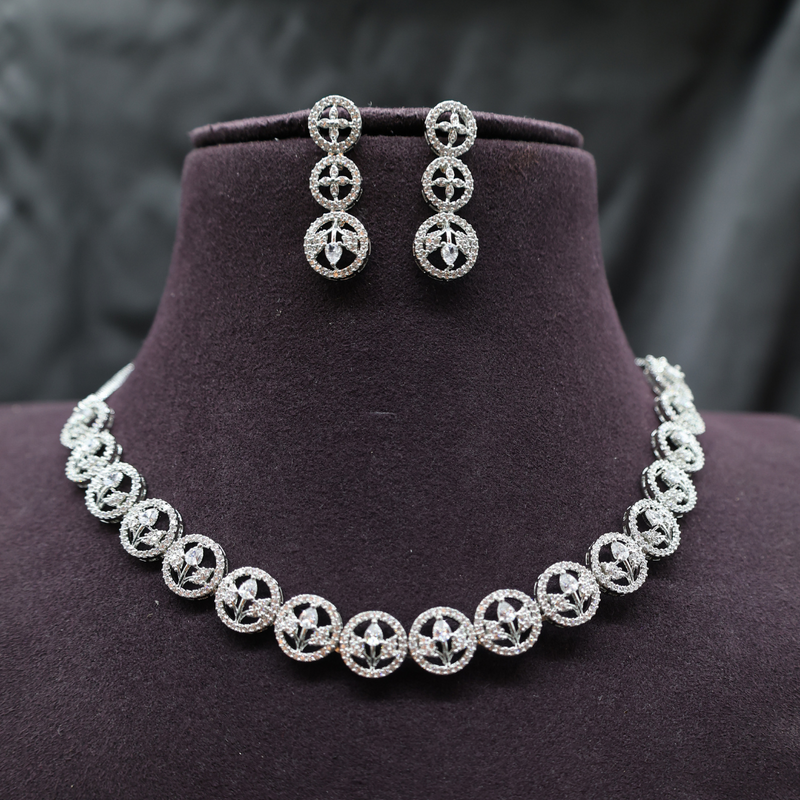Round Floral AD Necklace Set | Silver-Plated Circular Design Jewellery for Occasions
