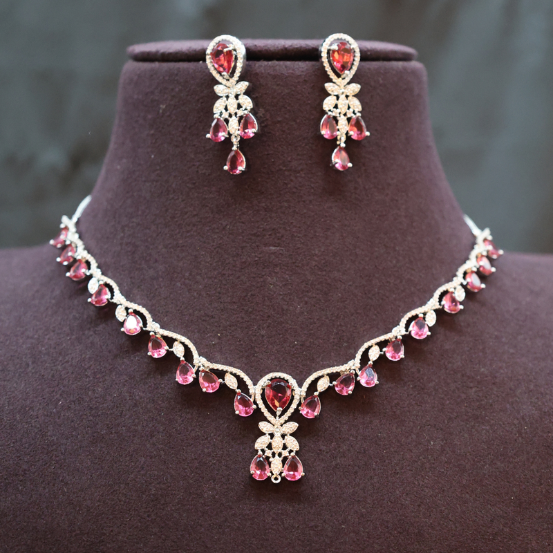 Pink Teardrop Stone AD Necklace | Silver-Plated Party Wear Jewellery