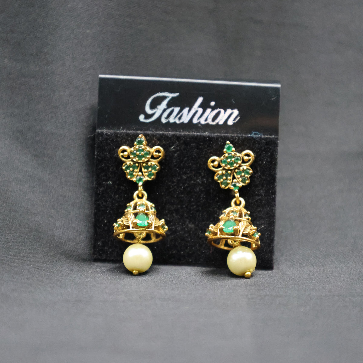 Antique Green Stone Jhumka Earrings with Pearl Drop – Copper & Brass