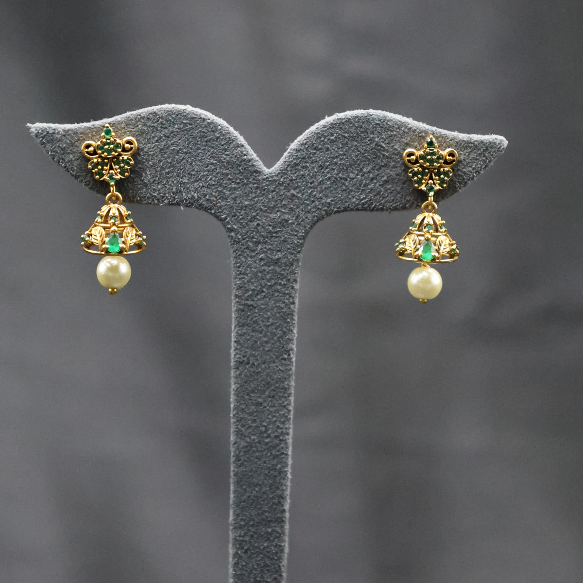 These Antique Green Stone Jhumka Earrings are a perfect expression of timeless elegance, crafted from copper and brass with a rich gold polish. The earrings feature a floral-inspired stud embellished with green stones, leading to a beautifully detailed miniature jhumka design. At the base of each jhumka hangs a single pearl drop, adding grace and sophistication to the overall look.