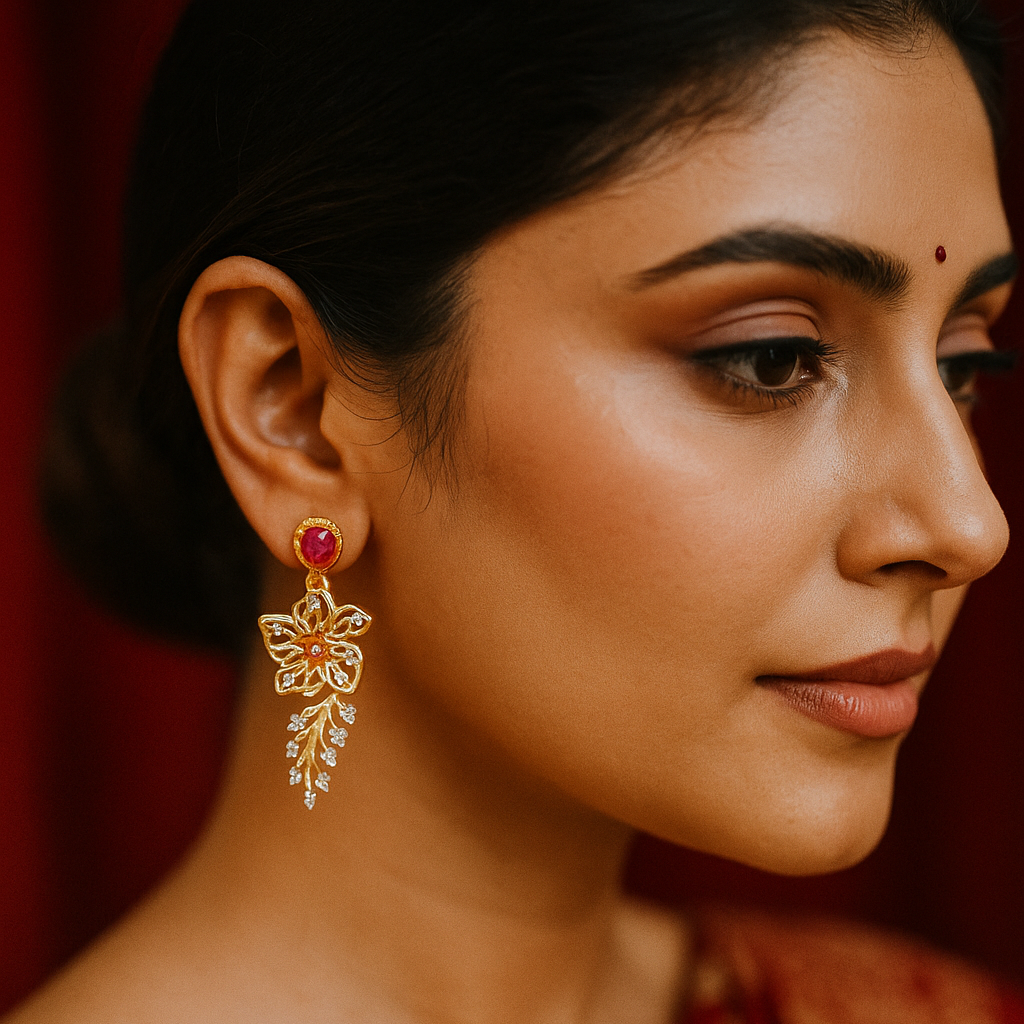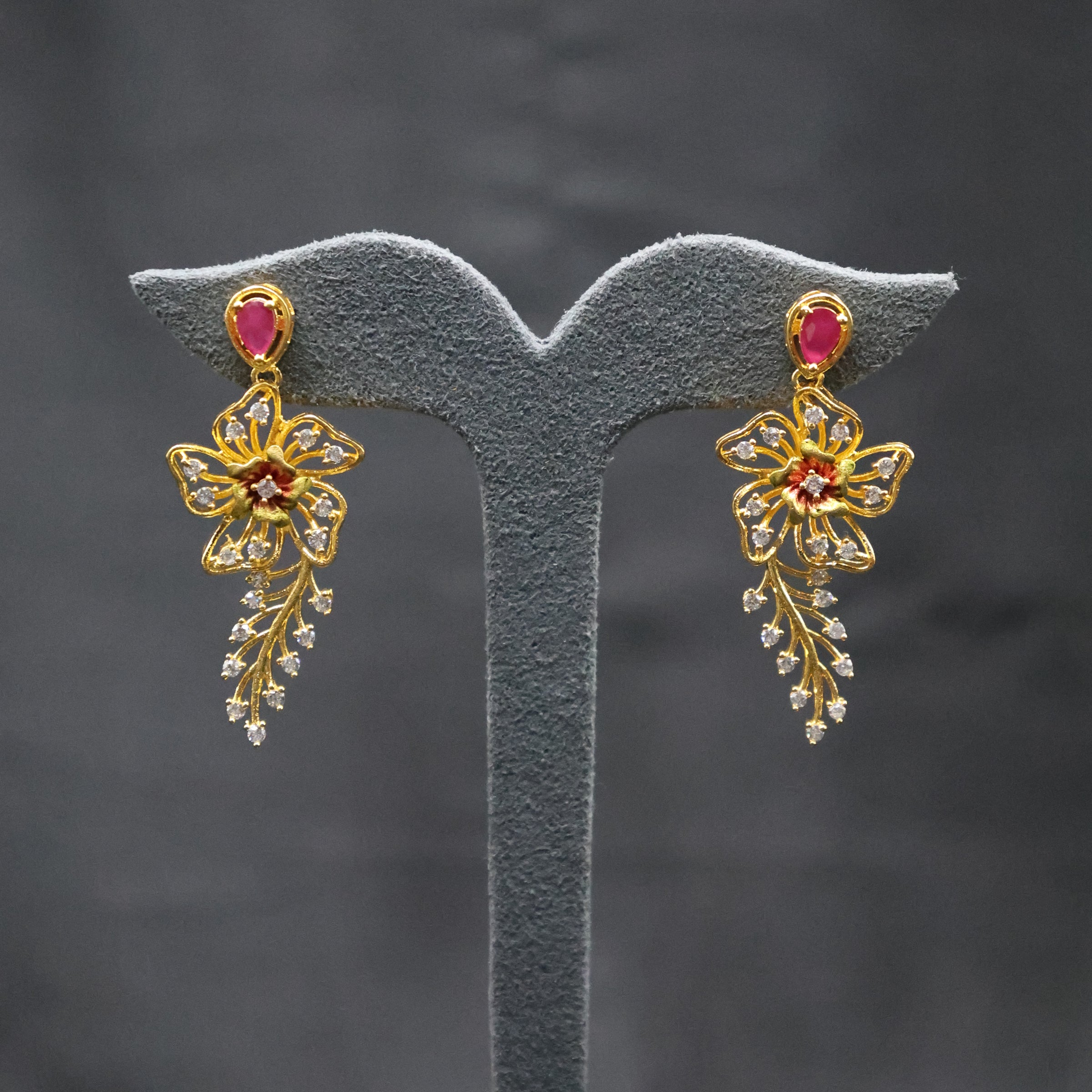 These enchanting floral drop earrings are crafted from copper and brass with a lustrous gold polish, designed to exude elegance and grace. Each earring features a beautifully open-worked five-petal flower motif, centered with a delicate red accent. From the flower extends a cascading branch-like design embellished with sparkling white stones, mimicking the natural flow of leaves or buds.