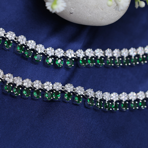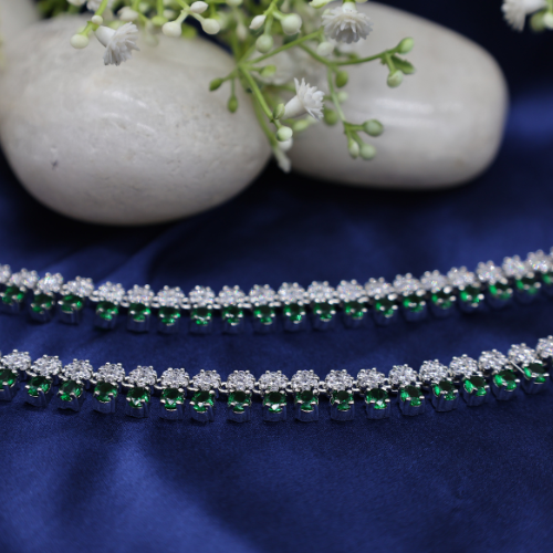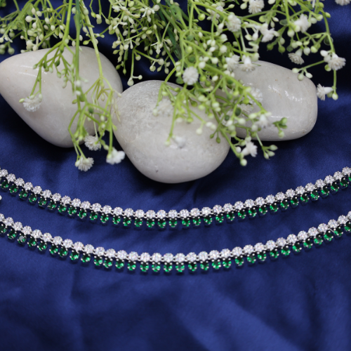 Step into elegance with this beautiful silver-tone Payal featuring dazzling American Diamonds and rich emerald green beads. A perfect blend of traditional charm and contemporary grace, this anklet is ideal for ethnic outfits, bridal wear, or festive occasions.