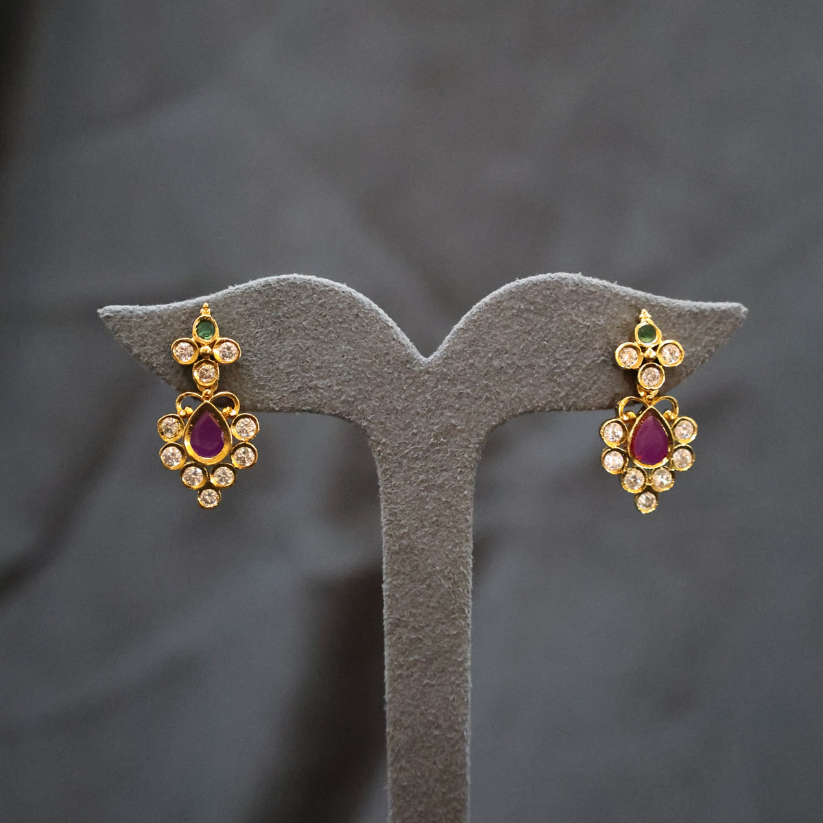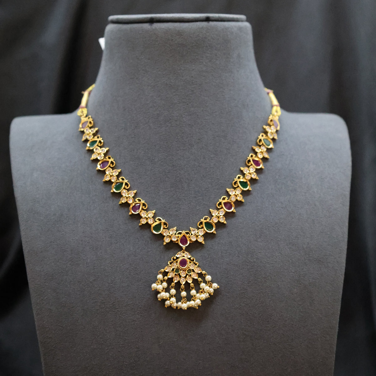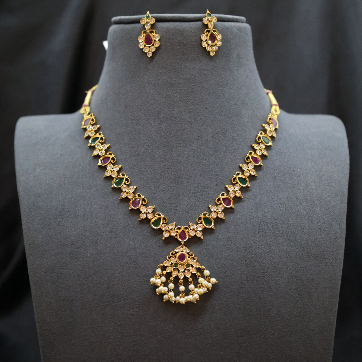 Add a touch of timeless elegance to your ethnic look with this copper and brass necklace set, designed with intricate stone embellishments and pearl accents. The necklace features alternating green and maroon teardrop-shaped stones, enhanced with sparkling white stones that bring out a graceful shimmer. The centerpiece pendant is beautifully adorned with a lattice design and finished with delicate pearl danglers, giving it a regal appeal. The set is perfectly paired with matching stone-studded earrings to complete the look.