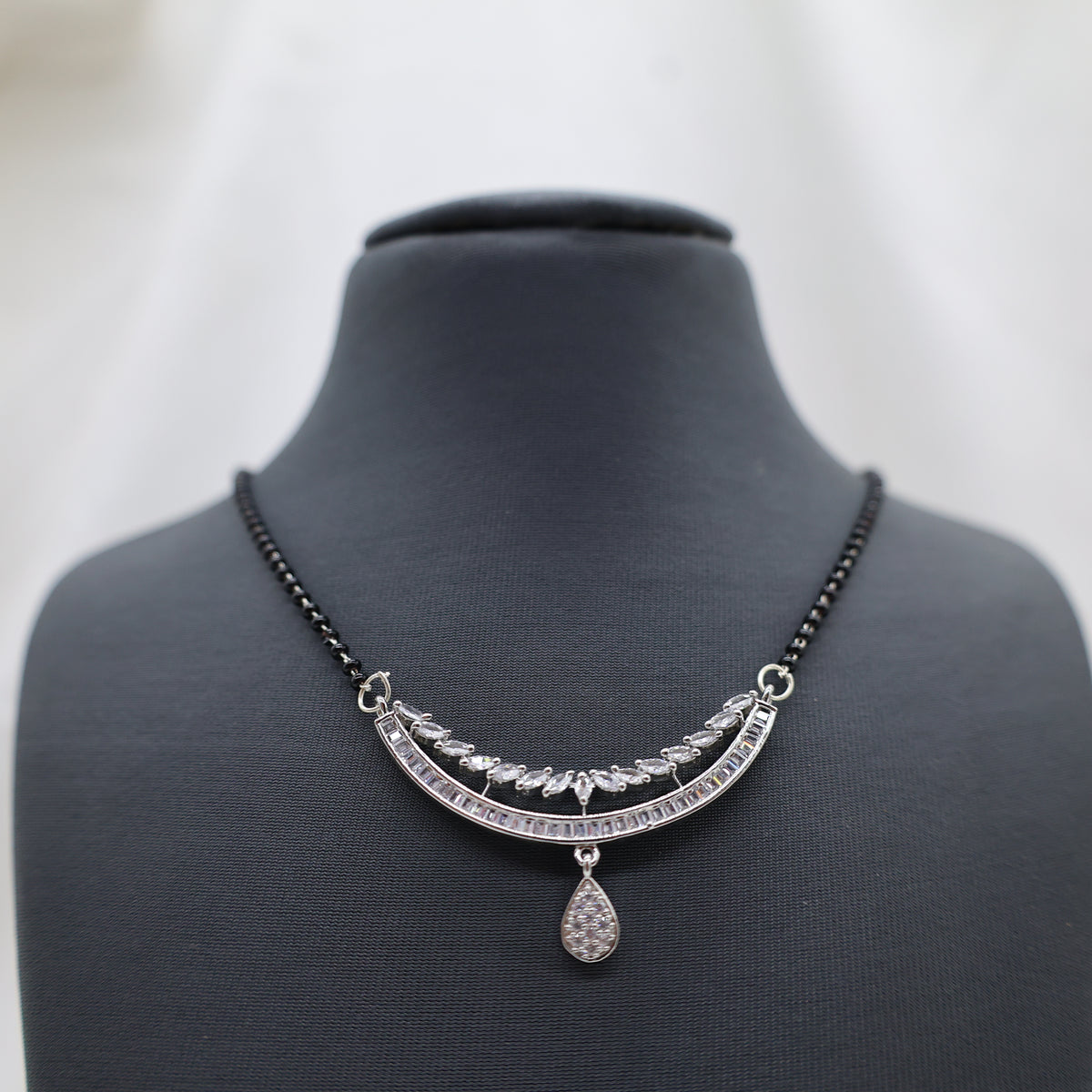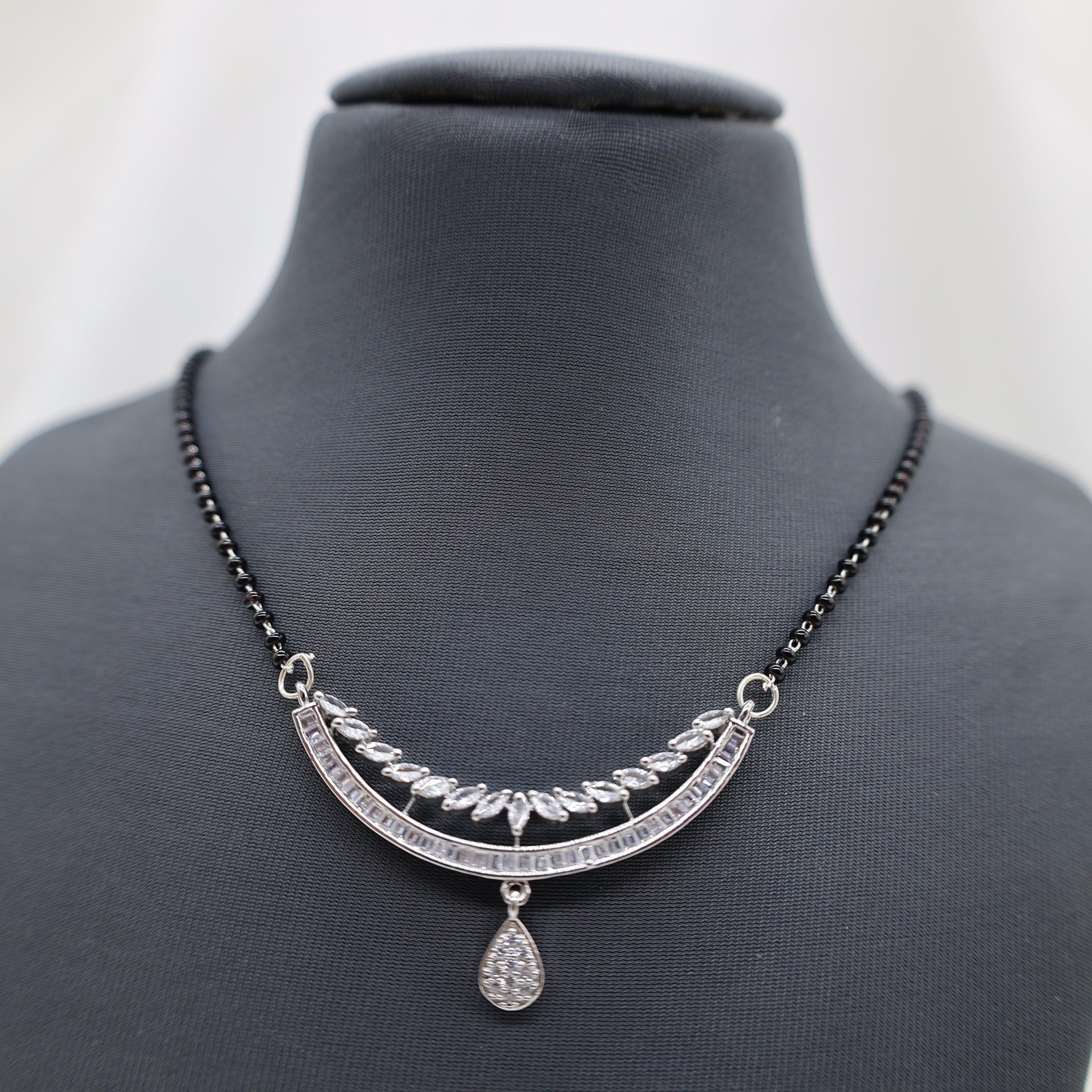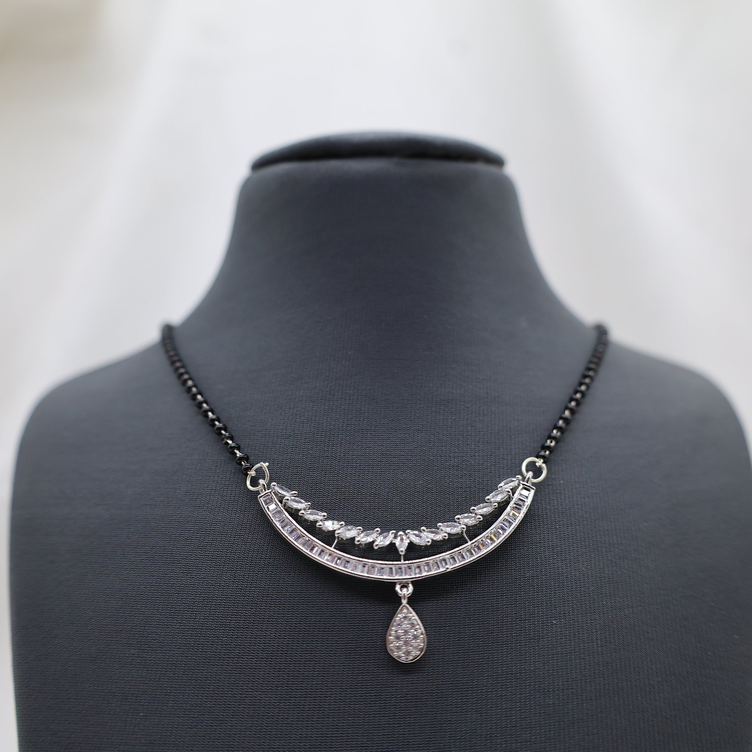 Add a touch of modern elegance to tradition with this beautifully designed mangalsutra necklace, crafted in premium copper and brass with a sleek rhodium-plated finish. The necklace features a single-strand black bead chain that gracefully leads to a sophisticated centerpiece adorned with sparkling CZ stones. Designed in a delicate leaf motif with a curved bar structure, the pendant is further highlighted by a teardrop-shaped dangler encrusted with shimmering CZs.