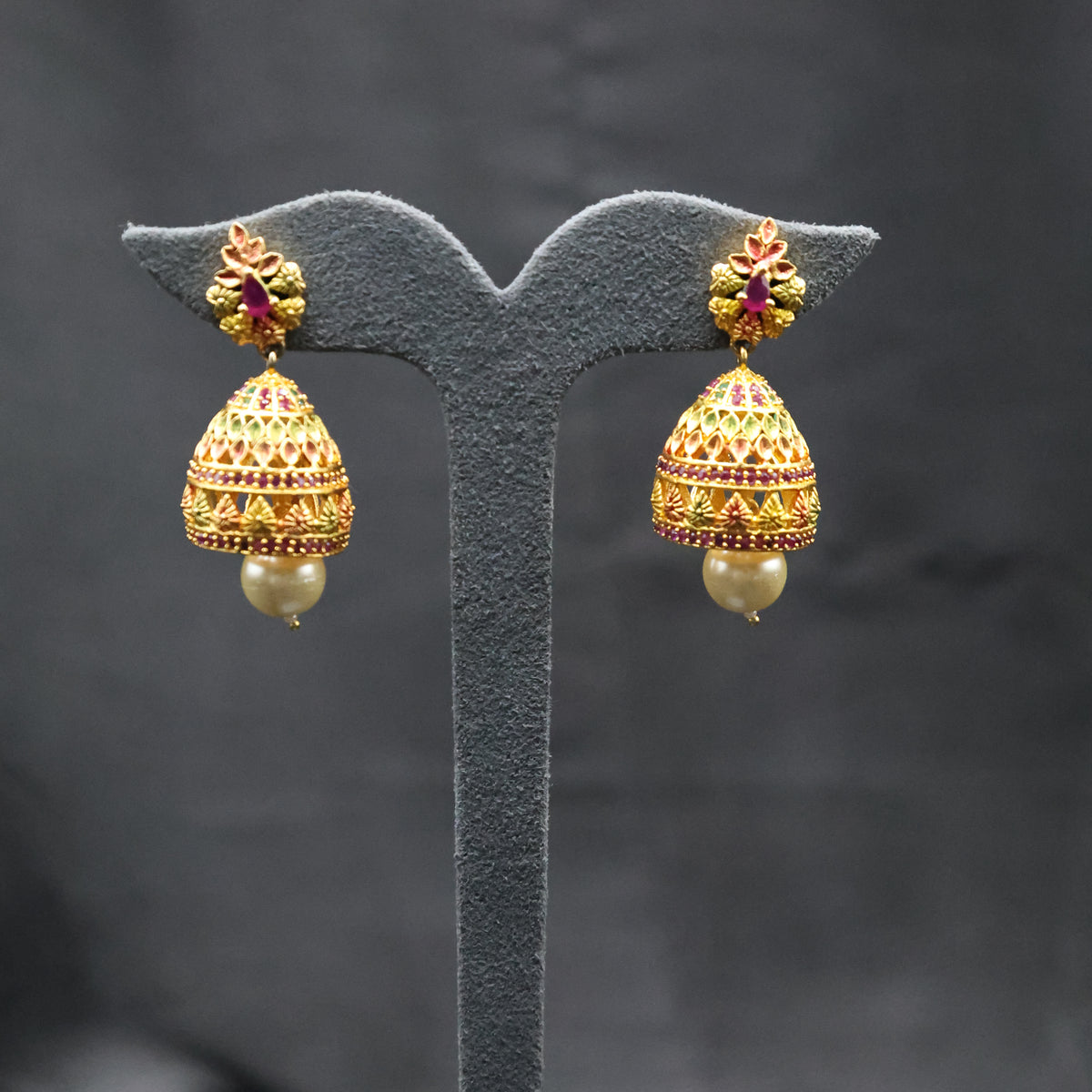 The dome-shaped jhumka is intricately designed with a lattice-style openwork pattern and highlighted with red and green enamel detailing, creating a striking contrast against the golden base. A smooth pearl drop at the bottom adds movement and charm, completing the traditional look.